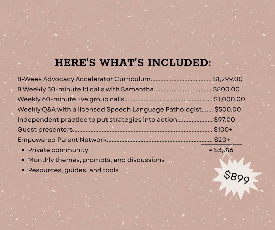 Progress doesn’t always look like instant answers. it often looks like clearer thinking, steadier emotions, and better questions. Those shifts alone can change everything about how advocacy feels and functions. I also offer 1:1 calls to hone in on your specific situation and help address any unique challenges you’re facing.